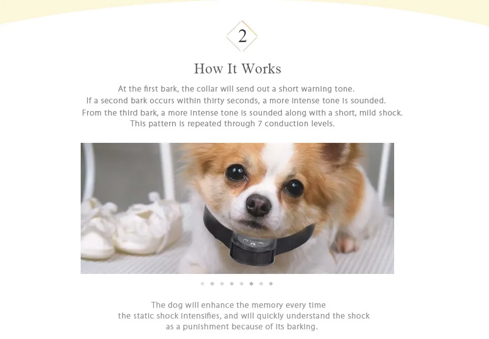 1. Au premier aboiement, le collier émet un bref signal sonore. Si un deuxième aboiement se produit dans les trente secondes, une tonalité plus intense est émise. Dès le troisième aboiement, une tonalité plus intense est émise, accompagnée d’un choc court et léger. Ce schéma est répété sur 7 niveaux de conduction.