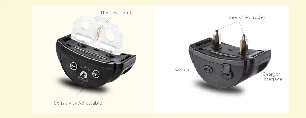 Contenu de l’emballage : 1 x Récepteur anti-aboiement, 1 x Collier en nylon réglable, 1 x Lampe de test, 2 x Electrode à chocs longs, 2 x Electrode à chocs courts, 1 x Manuel d’utilisation en anglais.
